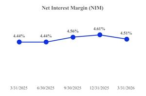 Our net interest margin was 4.51% and 4.61% for the three-month periods ended March 31, 2026 and December 31, 2025, respectively. The yield on loans was 7.08% and 7.30% for the three months ended March 31, 2026 and December 31, 2025, respectively, as average loans increased from $15.51 billion to $15.68 billion. The rate on interest bearing deposits decreased to 2.35% as of March 31, 2026, from 2.47% as of December 31, 2025, while average interest-bearing deposits increased from $13.47 billion to $13.66 billion.
