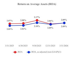 | The Company continued to demonstrate strong operating discipline throughout Q1 2026, posting an efficiency ratio of 41.6%. While modestly higher than the fourth quarter level, the efficiency ratio reflects continued, effective expense management and remains well controlled. The efficiency ratio, as adjusted (non-GAAP)(1), of approximately 42.0% underscores the consistency of underlying operating efficiency, highlighting the Company’s ability to balance investment in growth with disciplined cost management. | The Company delivered strong and improving return on average assets (ROA) during the first quarter of 2026, with an ROA of approximately 2.09%. This performance reflects both a year over year and sequential quarterly increase, underscoring continued balance sheet efficiency and disciplined execution. ROA, as adjusted (non-GAAP)(1), also increased to approximately 2.09%, demonstrating consistent earnings quality and effective asset utilization. Overall, Q1 2026 ROA highlights the Company’s ability to generate attractive returns while maintaining operational and financial stability. | |