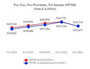 The chart below reflects solid year‑over‑year growth in pre‑tax, pre‑provision net revenue (PPNR) during the first quarter of 2026, reflecting continued strength in operating performance. PPNR totaled approximately $152.7 million, representing an increase of $5.6 million, or 3.8%, compared to the first quarter of 2025. PPNR, as adjusted (non-GAAP)(1), increased $9.9 million, or 6.9%, year over year to approximately $152.7 million, underscoring improved underlying profitability and disciplined expense management. | |