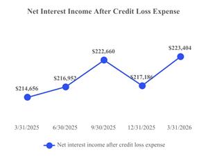 | Net interest income after credit loss expense increased by $6.2 million from Q4 2025 to Q1 2026 and $8.7 million on a year over year basis. These results reflect a generally upward trend throughout the periods presented, supported by effective balance sheet management and stable credit performance. Despite normal quarterly variability, the Company delivered consistent, high‑quality earnings, underscoring the strength and resilience of its net interest income. | Non-interest income was $42.8 million for the first quarter of 2026, reflecting a normalization from the levels experienced in prior quarters, primarily due to certain non-continuing other income items. Results remained supported by a diversified mix of revenue streams, with performance over the prior several quarters demonstrating the Company’s ability to generate stable non‑interest income despite typical quarterly variability. Management continues to emphasize disciplined execution and strategic growth initiatives to support long‑term, sustainable income generation. | |