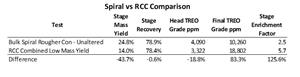 • Preliminary Reflux Classifier Concentrator (“RCC”) test results show an improvement in rare earth recoveries, with a lower mass yield when compared to spirals. In general, a lower mass yield can lead to positive operating benefits in the downstream hydrometallurgy processing and may result in lower operating and capital costs.