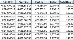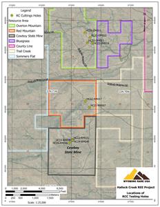 To test the effectiveness of an RCC unit at steady state ARR shipped approximately 2,255kg of Reverse Circulation (“RC”) cuttings to Nagrom based in Perth, Australia. RC cuttings from ten RC holes from Halleck Creek were shipped, see Table 1and Figure 1. Nagrom ground oversize material to 100% passing -300µm. Nagrom screened the RC cuttings into three size fractions: -300µm x +105µm (Coarse), -105µm x +45µm (Fine), and -45µm x 0µm (Ultra-fine). RCC testing was performed on the Coarse and Fine fractions. The Ultra-fine fraction is too small to effectively process using the current RCC unit at Nagrom.