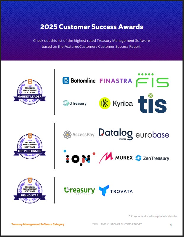 COOPER CITY, FL, UNITED STATES, November 11, 2025 /EINPresswire.com/ -- Today FeaturedCustomers published the Fall 2025 Treasury Management Software Customer Success Report to give prospects better insight on which Treasury Management Software would work best for their business according to real customer references.The highest rated vendors according to the Fall 2025 Treasury Management Software Customer Success Report are: